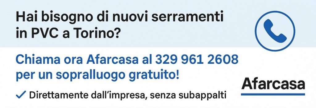 Con Afarcasa, ogni serramento in PVC a Torino è sinonimo di qualità, efficienza energetica e posa certificata. Scegli l’esperienza di un’impresa locale affidabile per trasformare la tua casa con stile e risparmio.